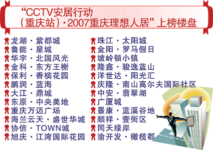 本報網站公眾調查推出“您最關心的安居問題”專題,通過市民投票,評出“十大安居問題”,包括住房價格、住房質量、開發商信譽度、小區配套設施、物管服務質量、小區交通、住房套型及朝向、小區安保、接房與產權證辦理、物管收費。同時對我市50個優秀商品房住宅小區多方評估,其中24樓盤入圍“重慶理想人居”(見表)。(2007年03月16日 重慶晚報)