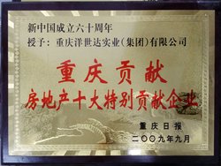 ? 2009年,洋世達(dá)集團(tuán)被評(píng)為新中國成立60周年“重慶貢獻(xiàn)?房地產(chǎn)十大貢獻(xiàn)企業(yè)”、“重慶市綠化先進(jìn)單位”、南岸區(qū)工商聯(lián)(總商會(huì)) 南岸區(qū)民營(yíng)企業(yè)家協(xié)會(huì)2009年度優(yōu)秀會(huì)長(zhǎng)單位、南岸區(qū)2008年度風(fēng)云企業(yè)評(píng)選年度招商企業(yè)、南岸區(qū)文明單位