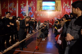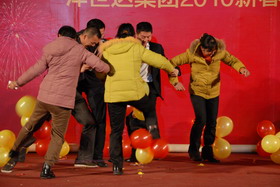 拔河對抗賽,是公司歷年“春節年拜會”上的傳統經典項目。下午1點30分,比賽戰鼓敲響,集團公司、各子公司分別組成8支參賽隊伍,進行分組對抗賽。比賽現場,參賽隊員摩拳擦掌,齊心協力,干勁十足;啦啦隊員吶喊助威,加油鼓勁,全情投入,掀起了一輪又一輪的高潮。經過緊張激烈的多輪對抗賽,物管公司蟬聯第一名,集團公司、帝力公司分獲二、三名。對抗賽結束后,由各公司優秀隊員組成的“明星聯隊”,還與冠軍隊進行了一場頗具實力的拔河表演賽。集團公司領導現場為獲獎者頒獎。